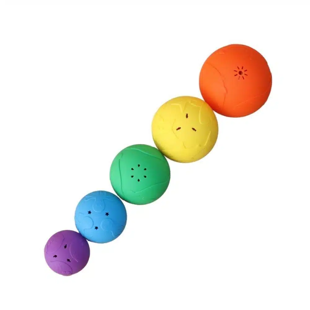 ¡Un juego de 5 boles apilables y 5 monedas del tesoro! Pueden ayudar a sus hijos a explorar la vida marina a través del juego sensorial. Apílelos, anímelos, esconda objetos debajo, estampe textura con arena o plastilina… ¡y haga coincidir las monedas con su taza!