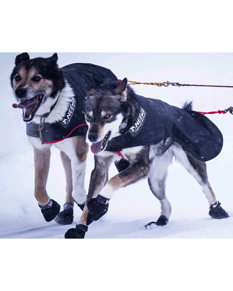 Neewa ha creado un abrigo deportivo y técnico muy fácil de llevar. Está confeccionada en nailon  resistente al viento y al agua , con un forro interior de  polar . La abertura frontal en el pecho del perro es de velcro y permite ponerlo y quitarlo muy rápidamente, dando también la posibilidad de ensanchar o apretar el abrigo en el cuello. Un  segundo cierre en el pecho  lo sujeta al cuerpo del perro. El abrigo está equipado con una  cincha de forro polar  , con un forro impermeable, extraíble y lavable que se fija a la prenda a través de dos tiras de velcro. A la altura de la cruz también hay una abertura  para pasar la correa y sujetarla al collar o arnés.