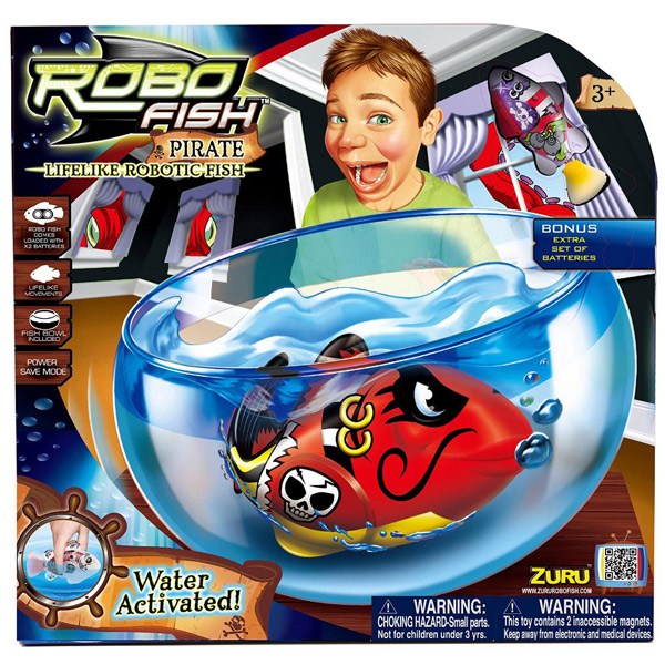 Nuevo acuario de Robofish versión Pirata. Complementa tus peces Robofish con este fantástico acuario que incluye también un pez Robofish pirata y decoración marina. Verás que el pez se activa automáticamente sólo con el contacto del agua. Que divertido! Edad recomendada: +3 años.
