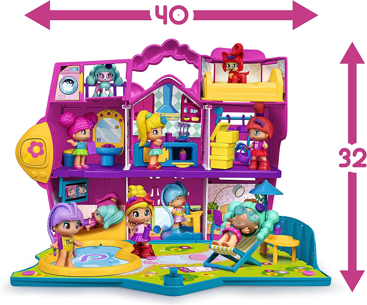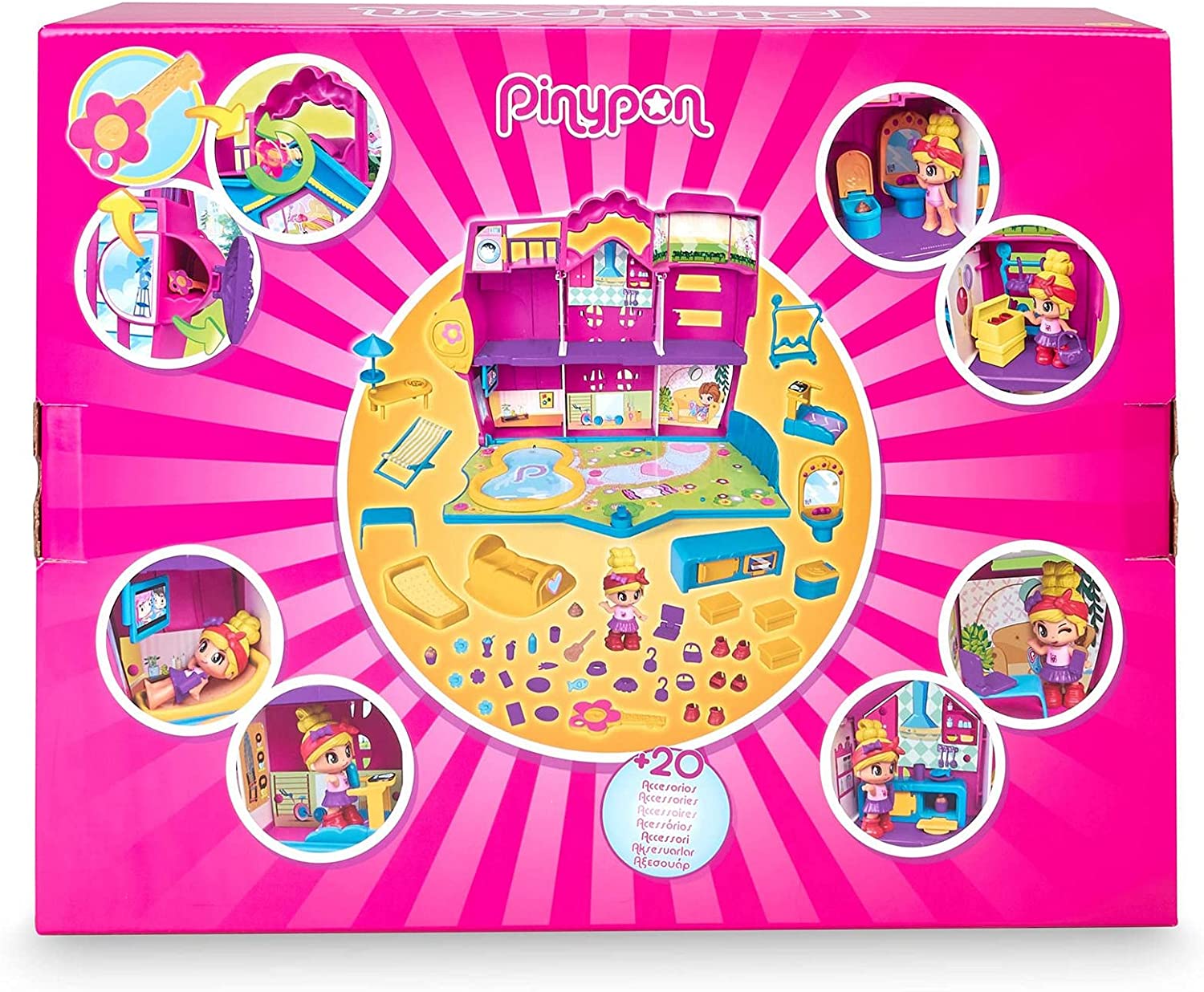 La casa tiene hasta 8 estancias para jugar, con muchos accesorios y decorados diferentes: dormitorio, baño, gimnasio, sala de descanso, despacho, cocina, vestidor y un jardín con piscina