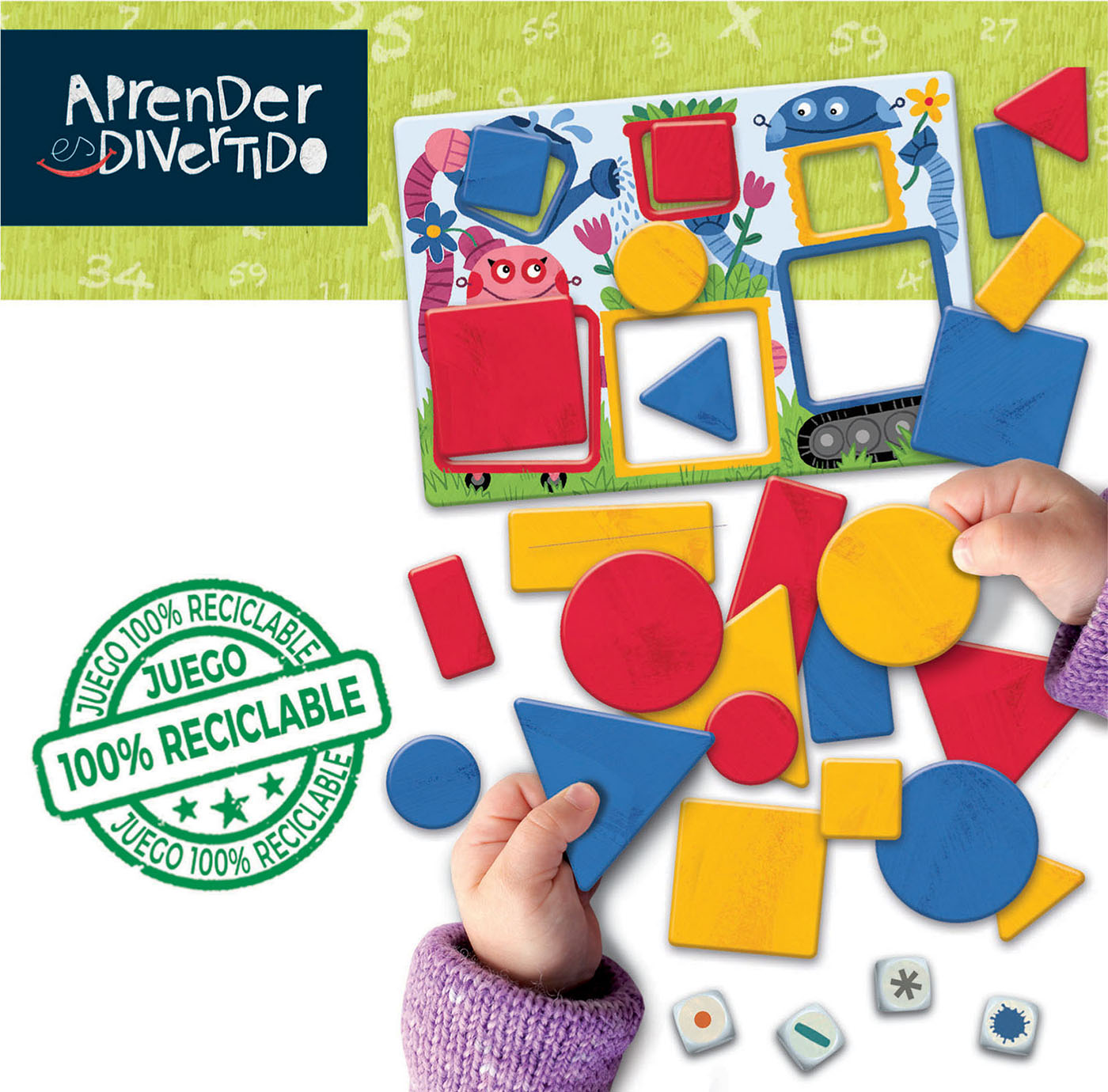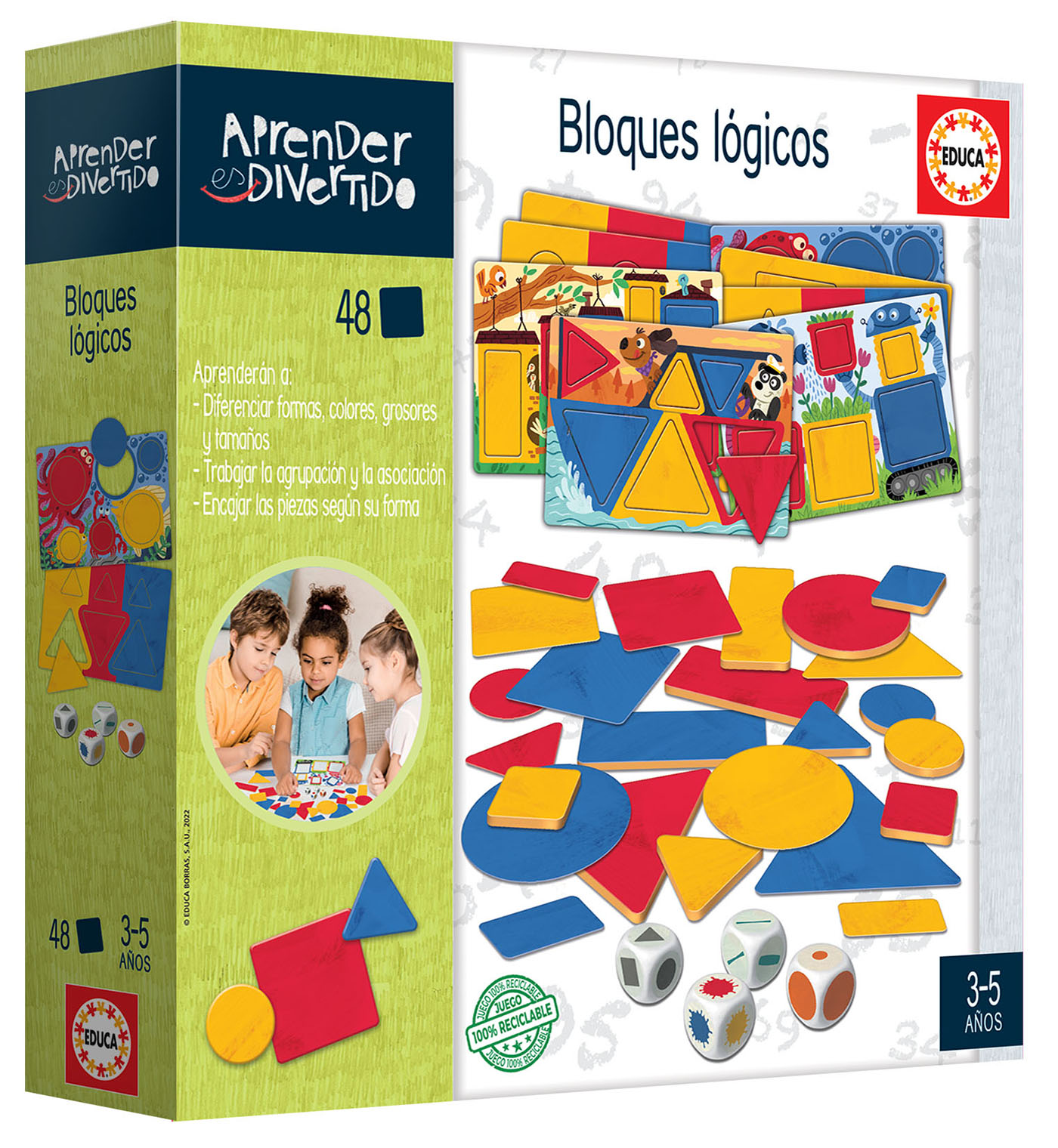 48 figuras de 4 formas distintas (cuadrado, rectángulo, triángulo y círculo), de 3 colores (amarillo, rojo, azul), de 2 grosores* (grueso y fino) y 2 tamaños (grande y pequeño) con las que los niños aprenderán los distintos conceptos y aprenderán a hacer asociaciones. 4 dados les indicarán qué formas deben buscar.