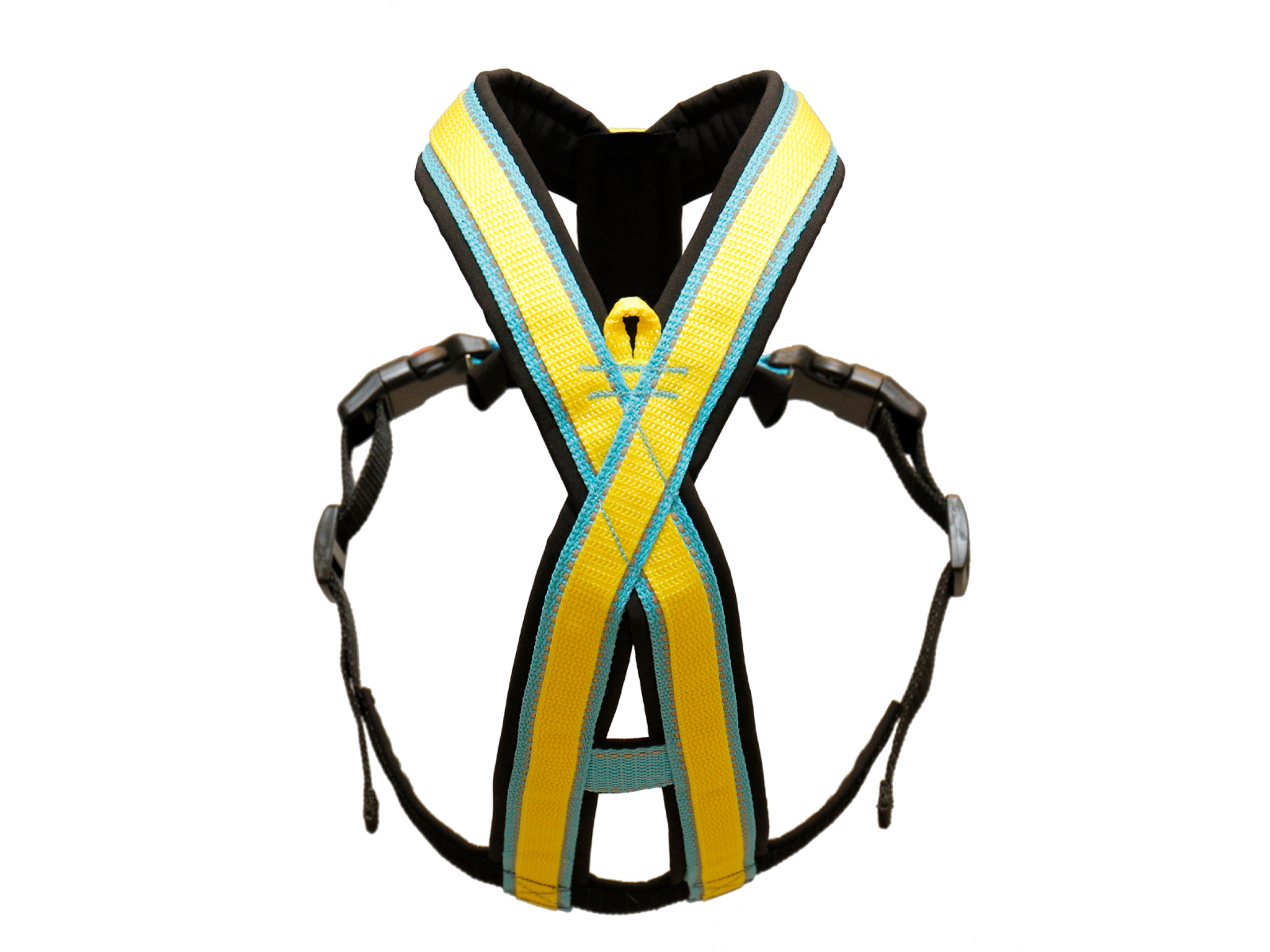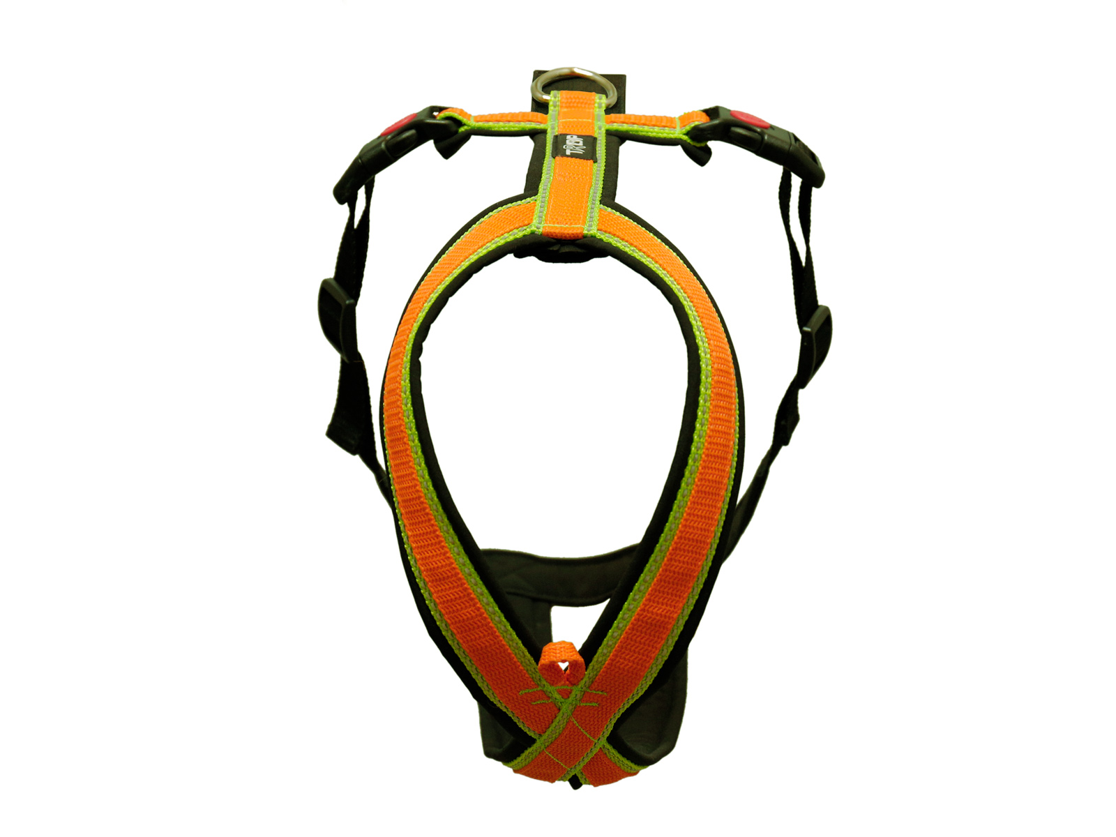 El arnés está completamente acolchado y ajustable alrededor del pecho. Se prestó especial atención al diseño de la parte debajo de la caja torácica del perro, donde las correas forman un triángulo que abraza muy bien el pecho del perro para brindar la máxima comodidad y asegura que la fuerza de tracción se distribuya correctamente. También es muy visible en la oscuridad gracias a las costuras reflectantes de la correa. Las hebillas tienen un cierre adicional para mayor seguridad y las correas dobles y el acolchado de caparazón blando impermeable hacen que el arnés sea cómodo pero resistente.