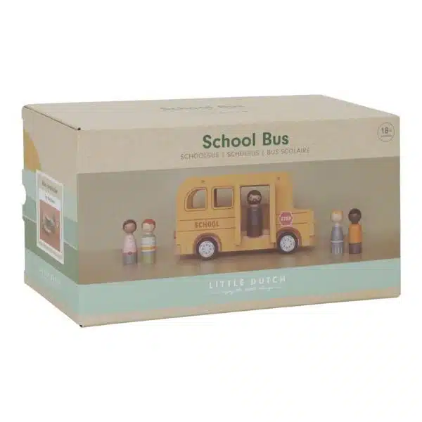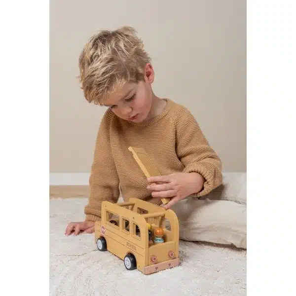 La puerta y el techo del autobús escolar de madera se pueden abrir y las figuras son compatibles con la casa de muñecas y otros juegos como el avión y el coche con caravana.