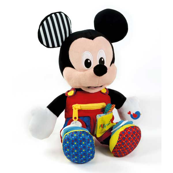 Un suave peluche de Baby Mickey con muchas actividades para estimular la manualidad de los más pequeños! El peluche está lleno de botones, texturas, cremalleras para abrir y cerrar, y un espejito en un bolsillo. Cuando aprietas una mano emite un sonido y en la otra mano esconde un simpático amigo que hace un efecto cucú. Las actividades de Baby Mickey ayudan al niño en el desarrollo de las capacidades manuales y sensoriales, y en la comprensión de la relación causa-efecto. Cada actividad permite al niño conocer las partes del cuerpo y ejercitar la manualidad controlando el error y potenciando las habilidades. Edad recomendada: +6 meses.
