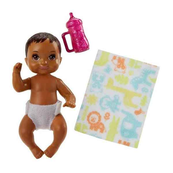 Muñeco bebé negro Babysitter de Barbie con accesorios (biberón rosa) de 7 cm de alto.