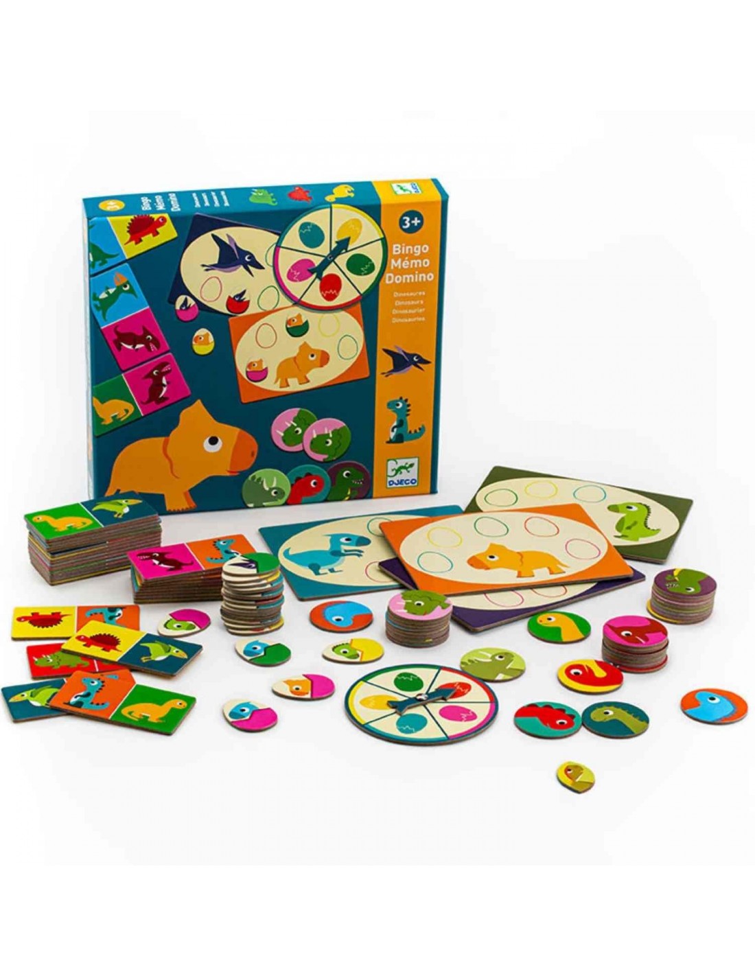 Caja muy completa con 3 juegos clásicos y muy educativos para introducir a los niños en el juego de reglas, desarrollar habilidades de razonamiento, memoria y por supuesto, pasar tardes muy divertidas. Incluye 4 tablillas y una ruleta, así como pequeños huevitos de dinosaurio para jugar al bingo. 15 parejas de dinosaurios para encontrar en el memory y 28 piezas de dominó con ilustraciones de dinosaurios por una cara y los números por la otra.