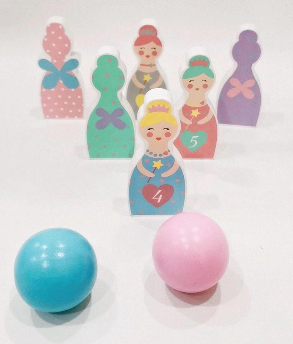 Juego de bolos de hada con 6 bolos y dos pelotas de madera.