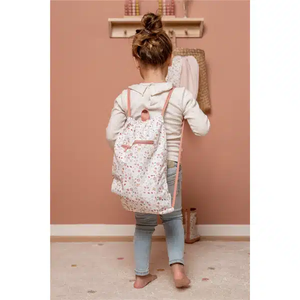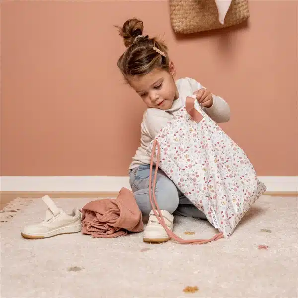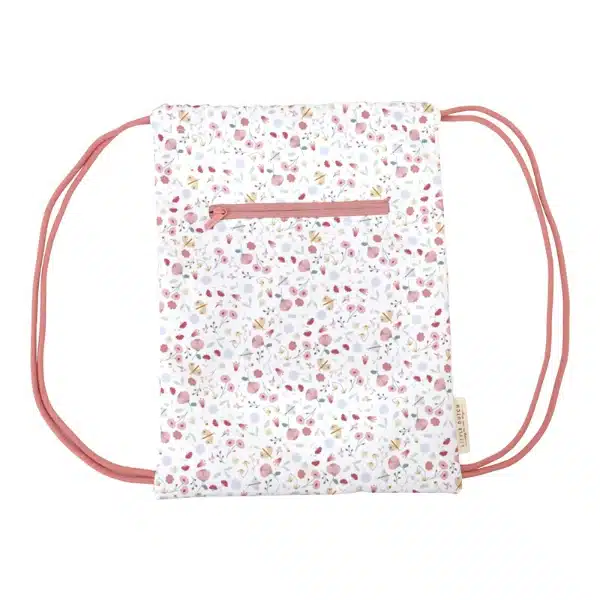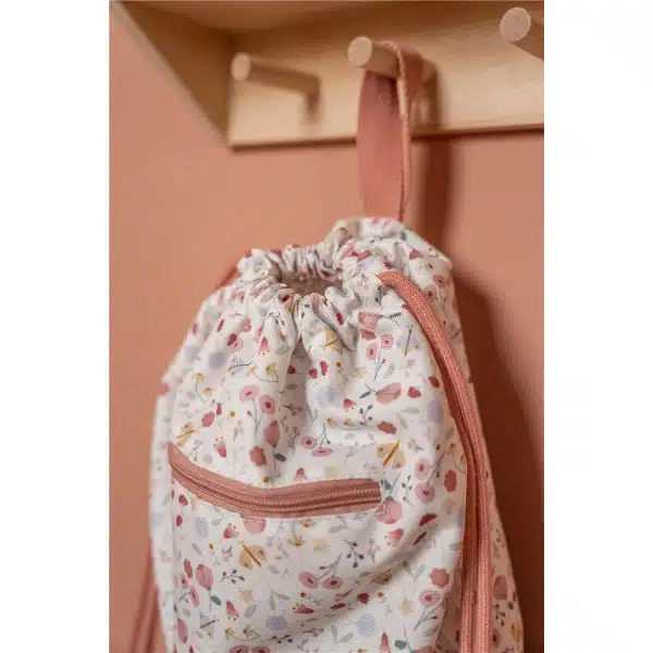 Esta bonita bolsa de deporte con estampado de flores y mariposas está hecha de botellas de PET recicladas. El bolsillo con cremallera en la parte delantera de la bolsa también se puede utilizar como almacenamiento adicional. La bolsa tiene un asa y cordones dobles que le permiten a su hijo usarla como una mochila. La bolsa de deporte mide 38 x 29 cm. Puede escribir sus datos de contacto en la etiqueta en el interior de la bolsa.