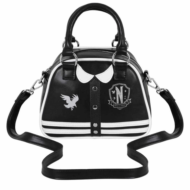 - Diseño Inspirado: El bolso toma inspiración del uniforme deportivo de la academia Nevermore de Wednesday, con detalles que reflejan la esencia misteriosa de la serie.