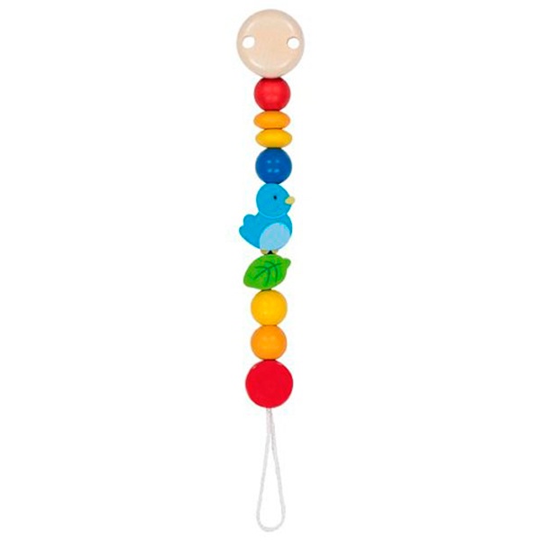 Cadena de madera para chupete en vivos colores y con un bonito pajarito azul.