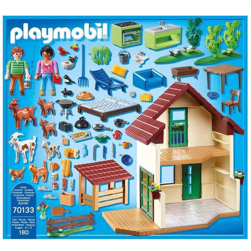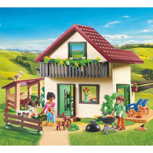 Casa de Campo con recinto para cabras, muchos animales, accesorios y pareja de granjeros.
