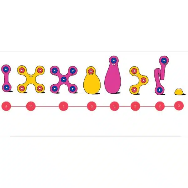 Contiene 30 piezas en 8 formas únicas de CLIXO, incluidas 3 «spinners» para poder construir creaciones que giren sobre sí mismas.