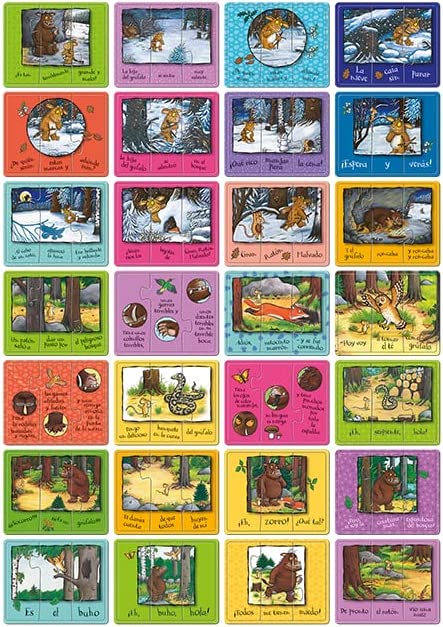 Cada puzzle incluye una escena de algunos de los cuentos de El Grúfalo, así como una frase de la imagen representada.