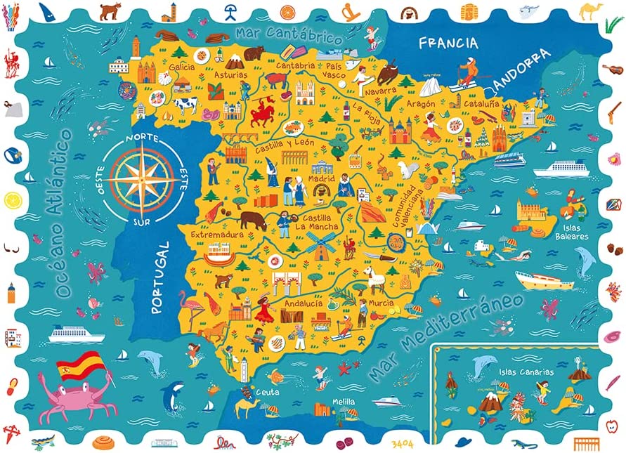 Puzzle de gran tamaño: 70 x 50 cm, con lupa de madera para poder recorrer todos los rincones de la Península y aprender muchos aspectos típicos de España.