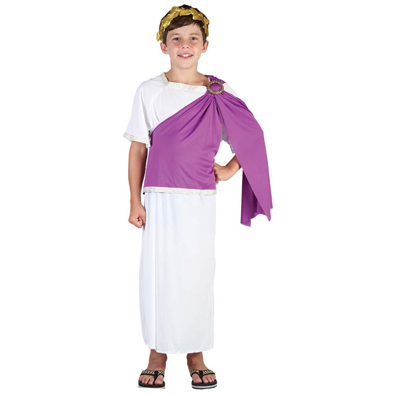 Con este disfraz de emperador podrás disfrazar a los más pequeños de forma sencilla y rápida en Carnavales, cumpleaños y fiestas temáticas. El disfraz está compuesto por una toga blanca con decorado en el cuello, una túnica en morado para darle un acabado a tu disfraz y corona.