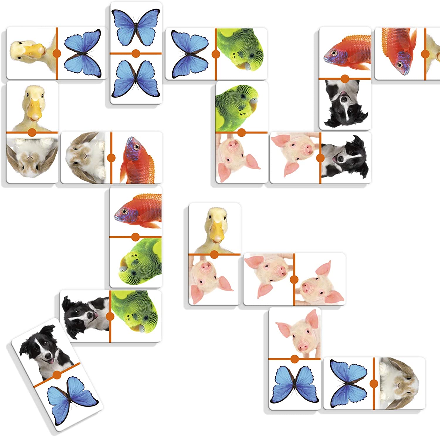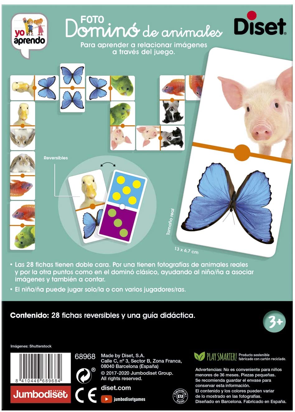 Dominó de 28 piezas reversibles; Por un lado tiene fotografías reales de animales y, por el otro, puntos de colores como el clásico juego