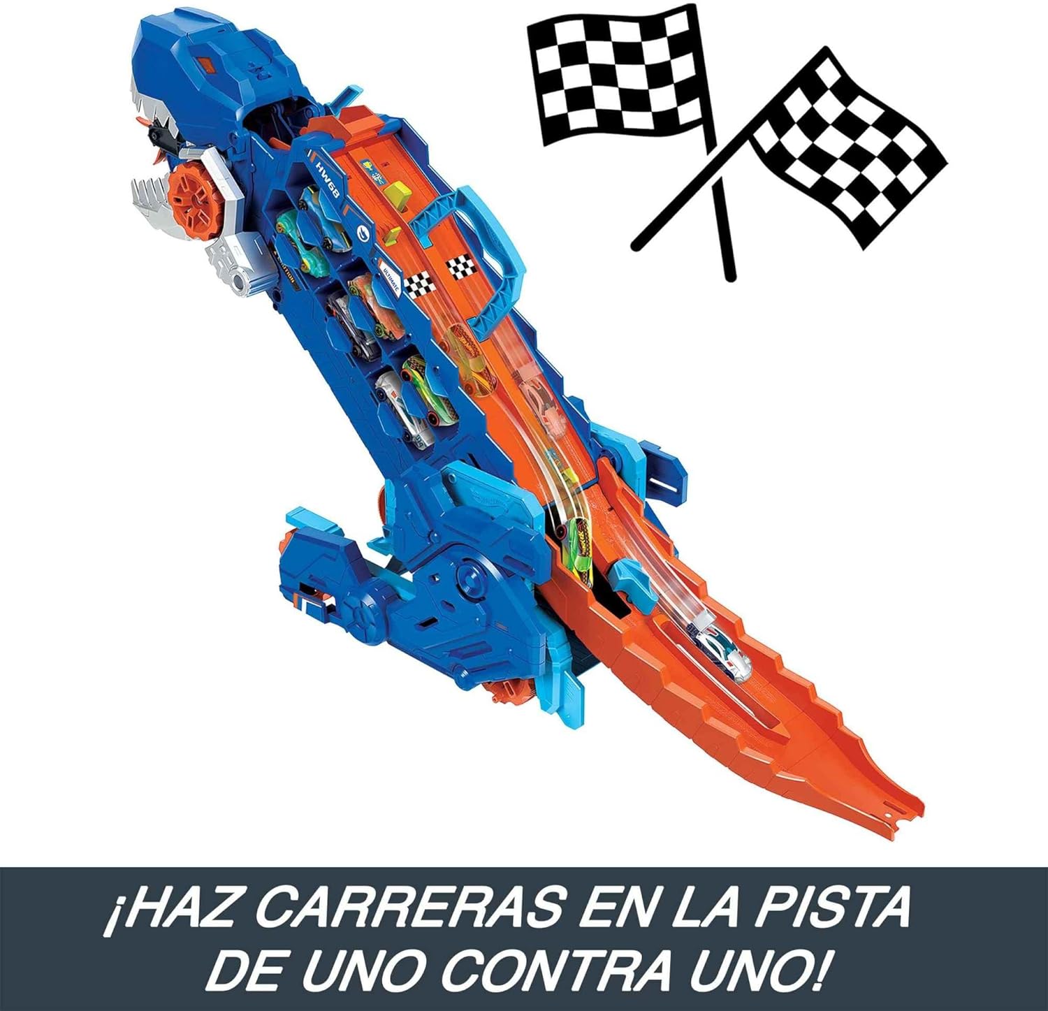 Haz carreras con los coches Hot Wheels incluidos en la espalda del tiranosaurio. El ganador podrá continuar su camino, pero el perdedor saldrá disparado por la boca del dinosaurio.