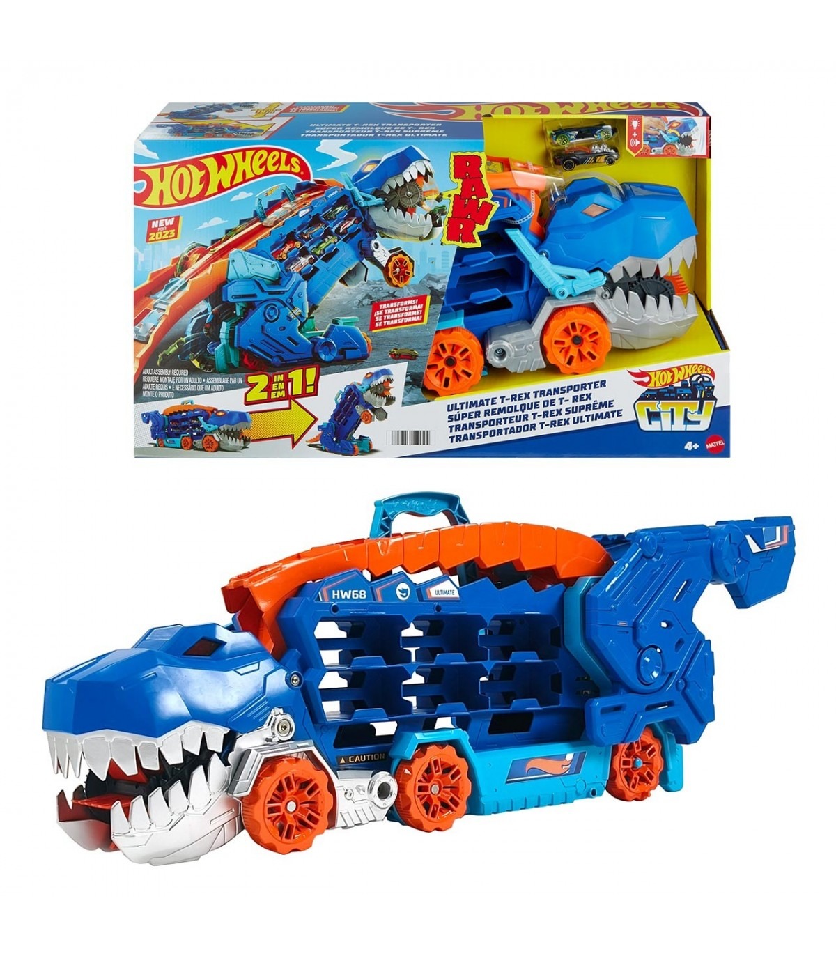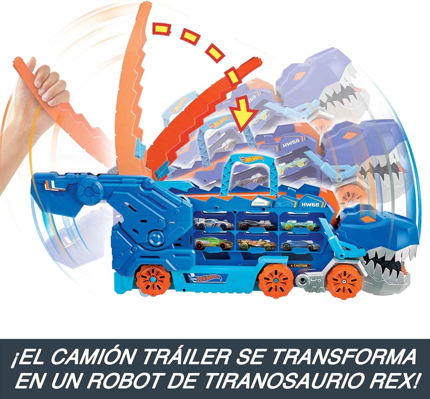 Tira de la cola y el camión se transformará en un tiranosaurio Rex, que incorpora una acción de pisoteo acompañada de luces y sonidos.