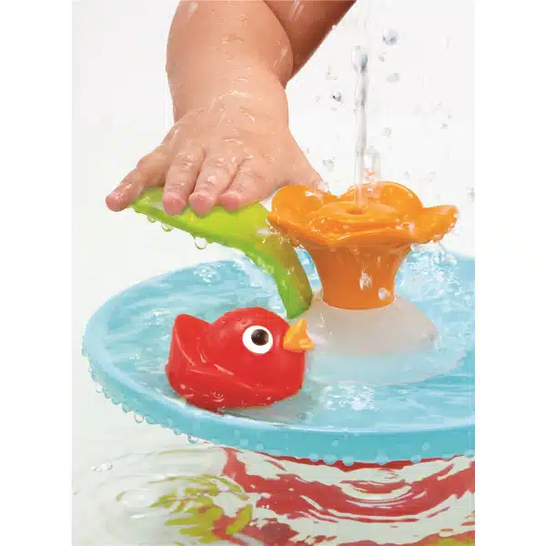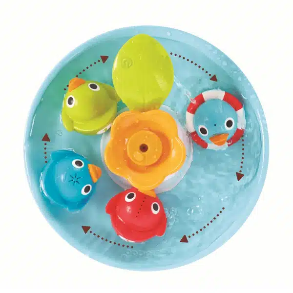Un juguete de baño a pilas que impulsa el agua de la bañera creando una fuente única y una pista de carreras. La palanca con forma de hoja verde activa los efectos de fuente y agua. 4 coloridos patos se persiguen alrededor de la fuente. ¡Cada pato tiene un efecto único y diferente de rociado de agua! Se apaga automáticamente después de 3 minutos.