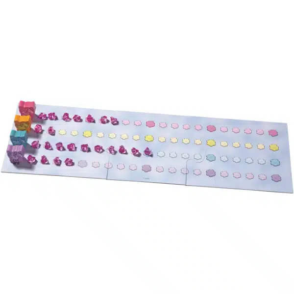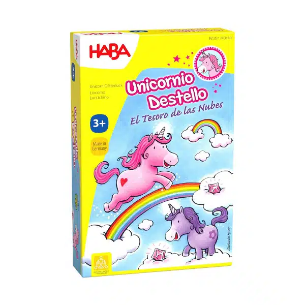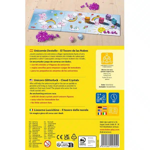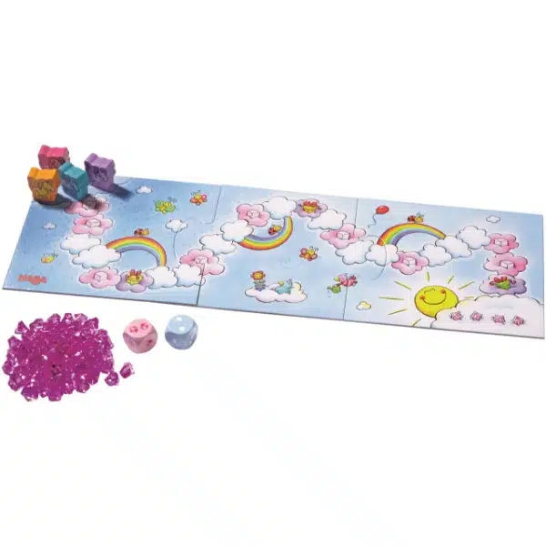 Encantador juego de recorrido en el que los unicornios deben recorrer el país de las nubes en busca de cristales. Con la ayuda de los dados avanzan por el tablero o recogen cristales, y quien alcance primero la meta logra 4 cristales adicionales. Gana quien acumule más cristales. Tablero a doble cara con contador de cristales en el reverso.