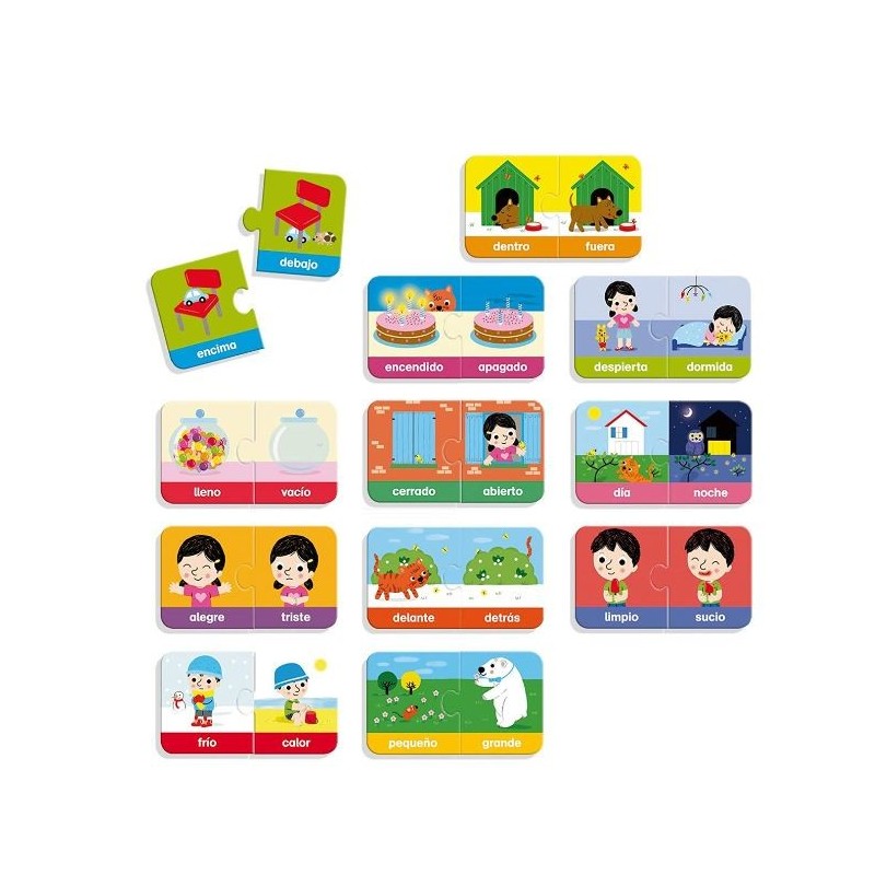 Contenido: 12 puzzles de 2 piezas con 24 conceptos