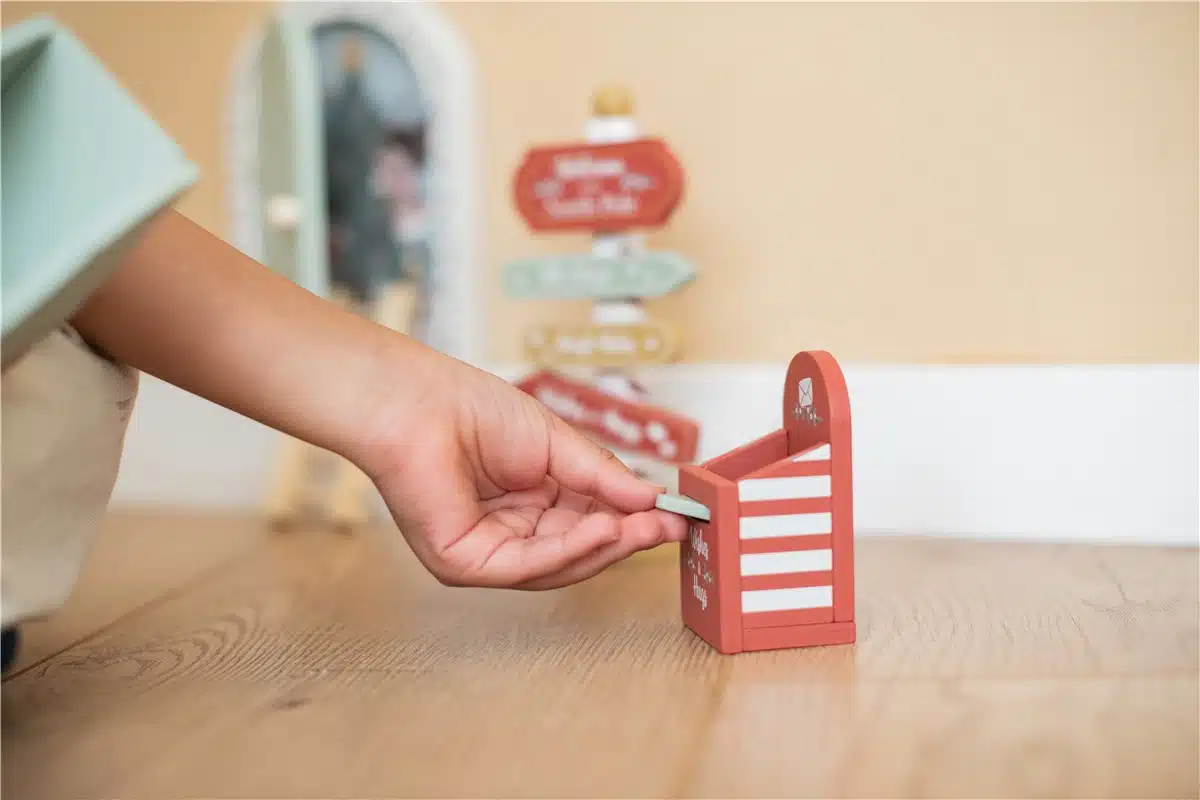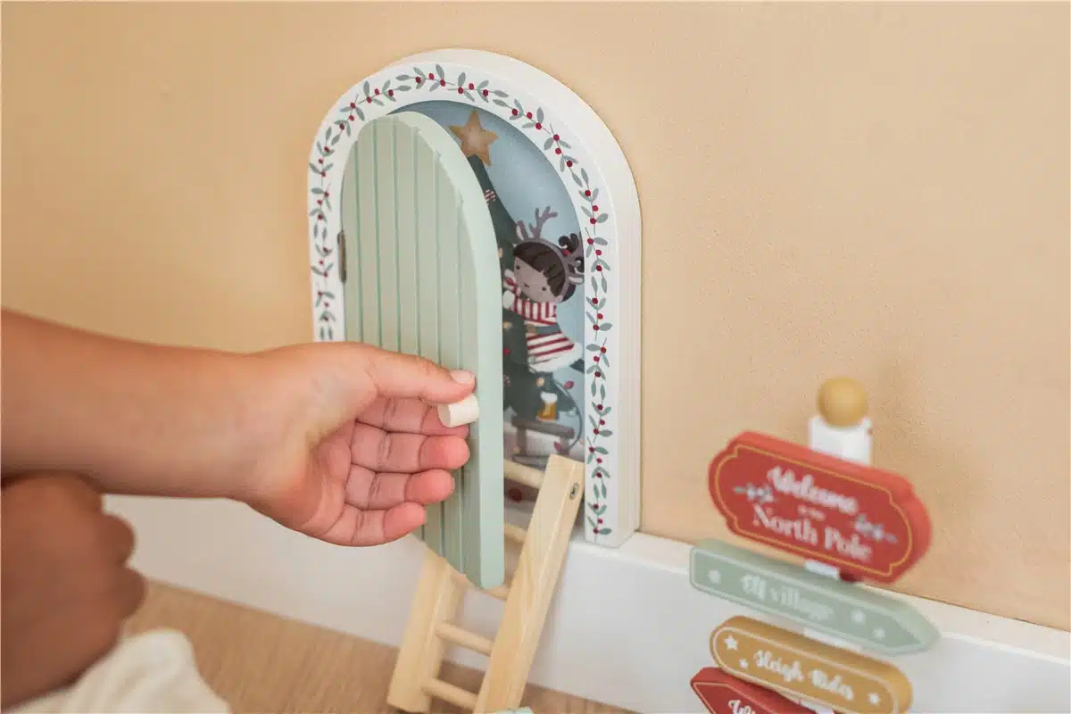 El kit incluye una puerta, una escalera, un buzón, un trineo, un buzón, cartas y un poste con diferentes direcciones. y una imagen navideña que se podrá encajar en el marco de la puerta para crear una estampa muy navideña.