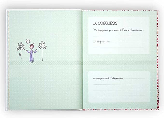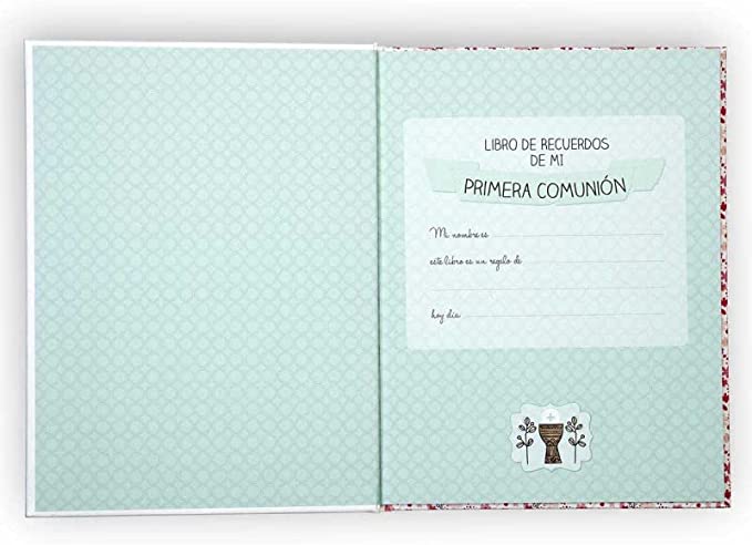 Nuevo diseño interiores 29 páginas en el inicio a todo color con los textos más relevantes de la celebración de la comunión. El resto de páginas son en blanco para incorporar fotos o dibujos. 38 hojas interiores, 76 páginas de 30 x 22,5 en papel blanco de 250 grs, evitando que transparenten las inscripciones.