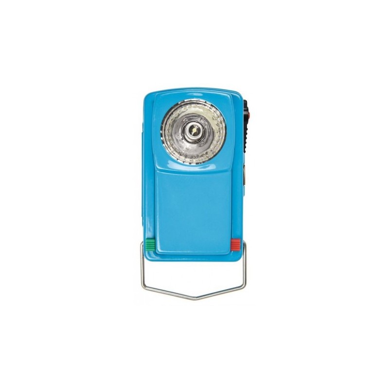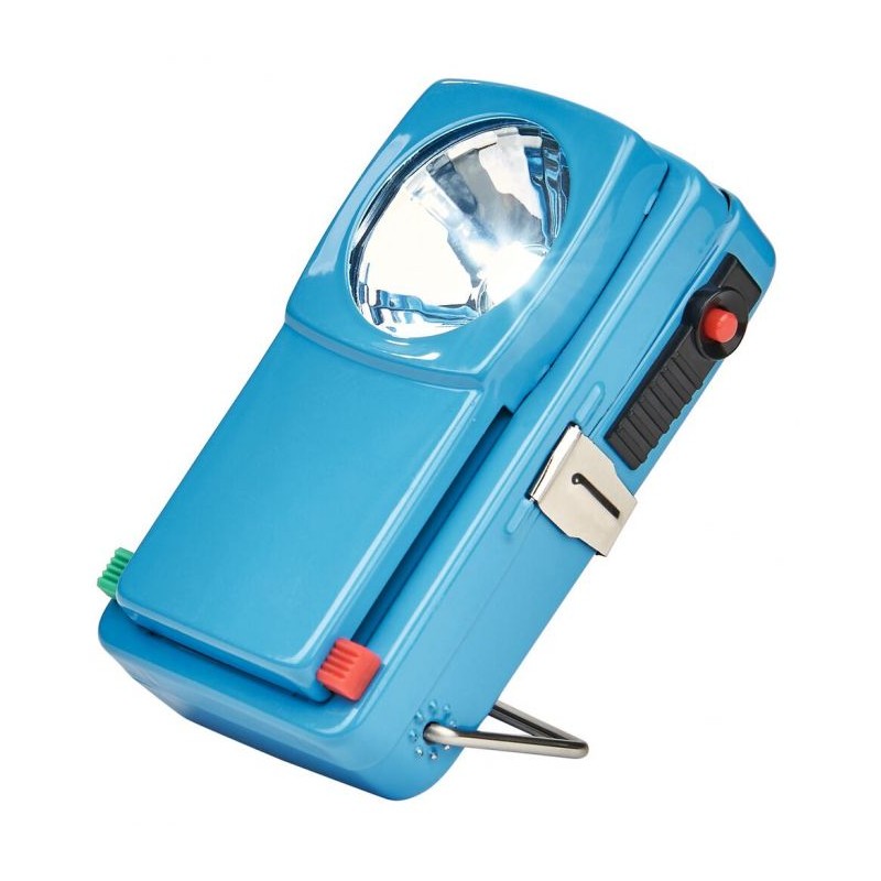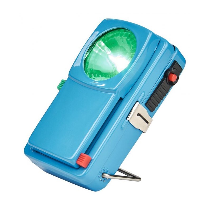 Incluye interruptores deslizantes para poner filtros de colores (luz verde/luz roja) y un botón lateral para emitir señales de morse.