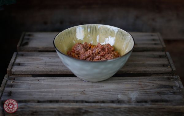 Tierno filete de pechuga de pato (68 %) con calabaza de Hokkaido (18 %), manzana (7,4 %), 2% de harina de cáscara de huevo, un 1,5% de aceite de linaza, un 0,06% de algas y un 0,5% de levadura de cerveza completan el delicioso menú.