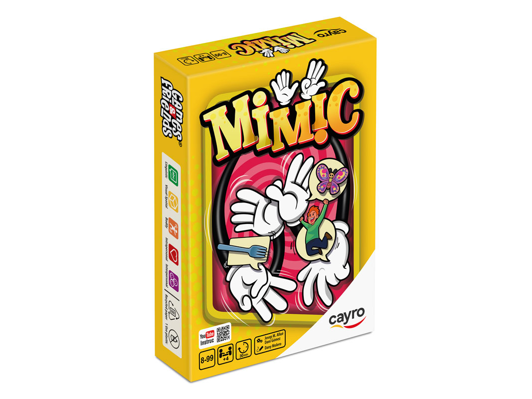 ¡¡Riesgo, mímica y frases disparatadas!! Mimic es un delirante juego de mímica y sonidos en el que, por turnos, un jugador de cada equipo, tendrá que representar el mayor número de palabras posible. El dado indica el número de palabras que se deberán interpretar, acertar y con las que formar una frase en un minuto. Si ha sobrado tiempo se puede arriesgar y volver a lanzar el dado para conseguir más tarjetas. Pero cuidado, que si te quedas sin tiempo y no se han resuelto todas las cartas que hay en juego se perderán tantas cartas como indique el dado en ese momento.