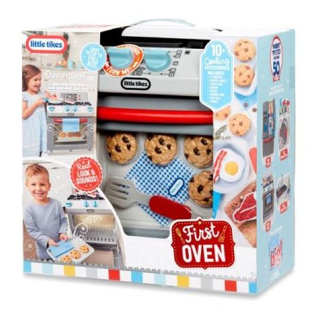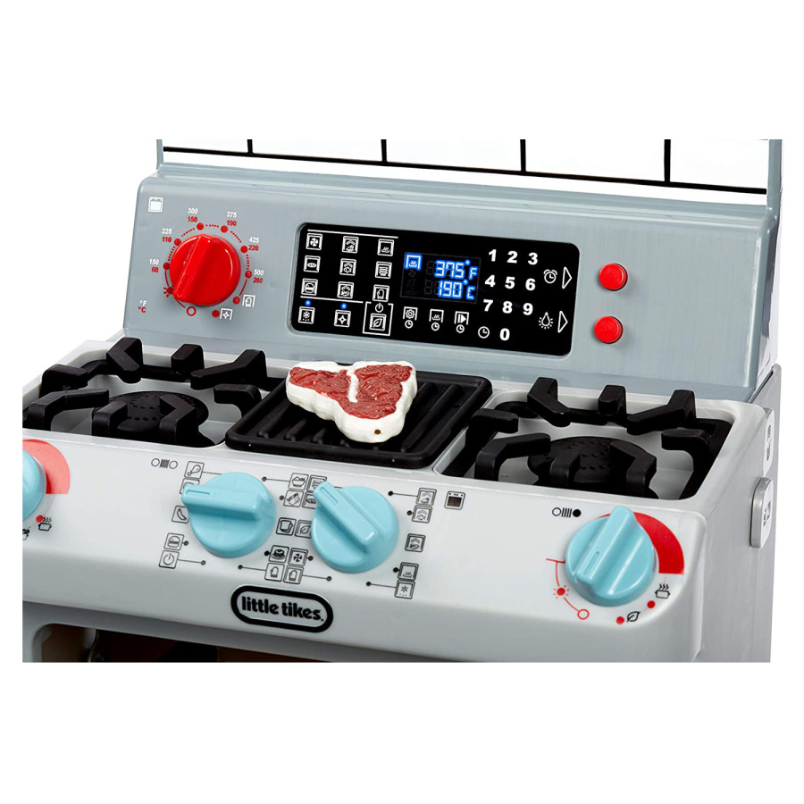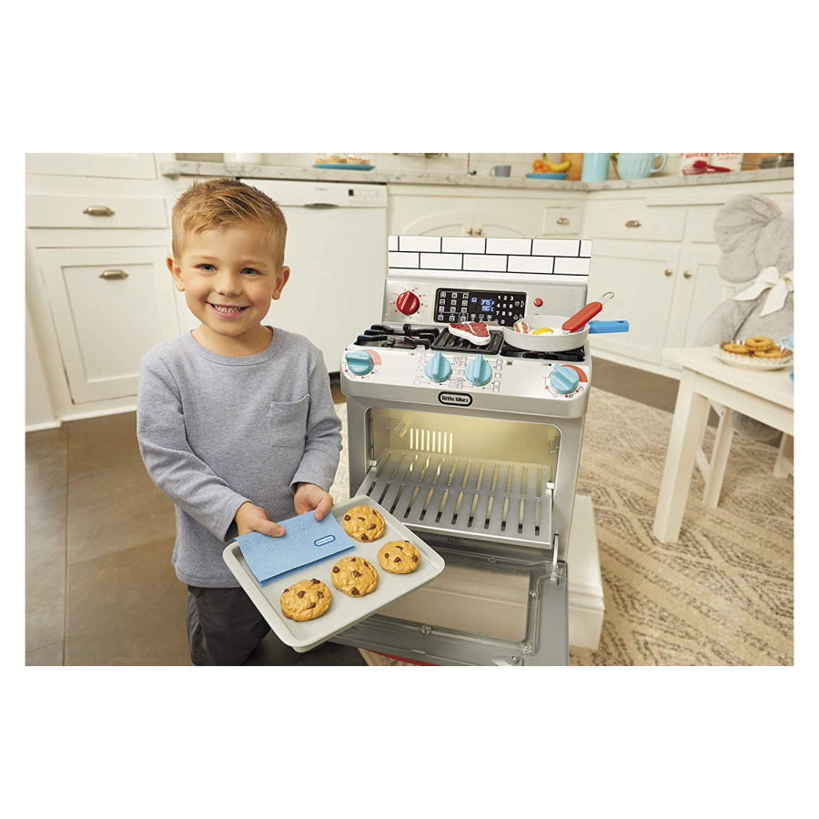 Este horno está lleno de sonidos realistas: quemadores encendidos, agua hirviendo, chisporroteo y temporizadores sonando. Otras características realistas incluyen que la estufa se ilumina, los botones realmente funcionan, la luz del horno se enciende cuando se abre la puerta, el estante del horno es extraíble y los diales del quemador giran