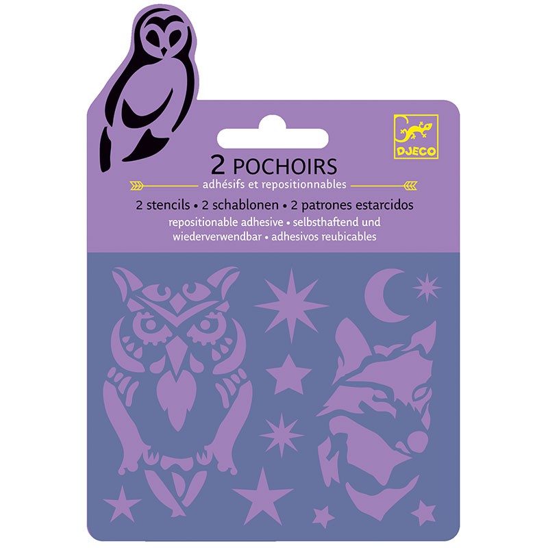 Incluye: 2 miniplantillas con animales nocturnos y motivos decorativos de la noche con adhesivo reultilizable.