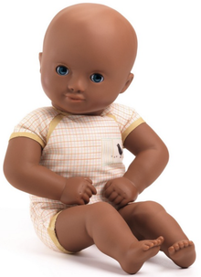 El cuerpo suave y flexible está hecho de tela de algodón estampado con un ribete a cuadros beig diseñado para parecerse a un body y acolchado de una manera que permite que se posicione como un bebé de verdad.