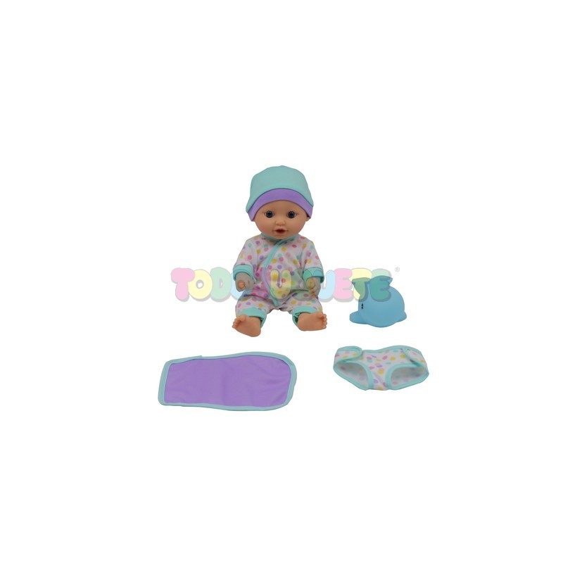 Muñeco bebé de 25 cm aproximadamente. Incluye un pañal de tela con cierres de velcro, una toallita y un divertido juguete para el baño. El juguete se ilumina cuando entra en contacto con el agua. Funciona con 3 pilas LR41 que no son reeplazables.