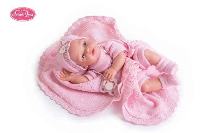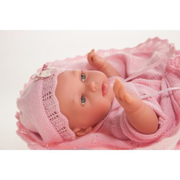 Está contenta con su toquilla a juego con la ropita que lleva de color rosa y con calados. La puedes colocar en diferentes posturas y mantiene la posición. Incluye: gorro, chupete, pijama, calcetines y toquilla.