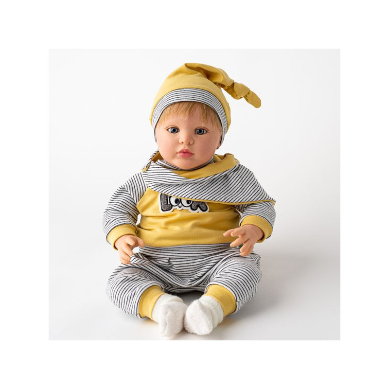Dima llega, nos mira, y nos enamora. Este muñeco Reborn de pelo rubio, vestido con un simpático chándal en tonos mostaza y rayas en blanco y negro, nos ha movido los pies del suelo. Gorrito y bandana, complementos que Dima nunca pierde de vista. Atractivo, deportivo y extrovertido, estos son los adjetivos que más representan a Dima. Está pintado a mano, y su carita vuelve locos a todos.