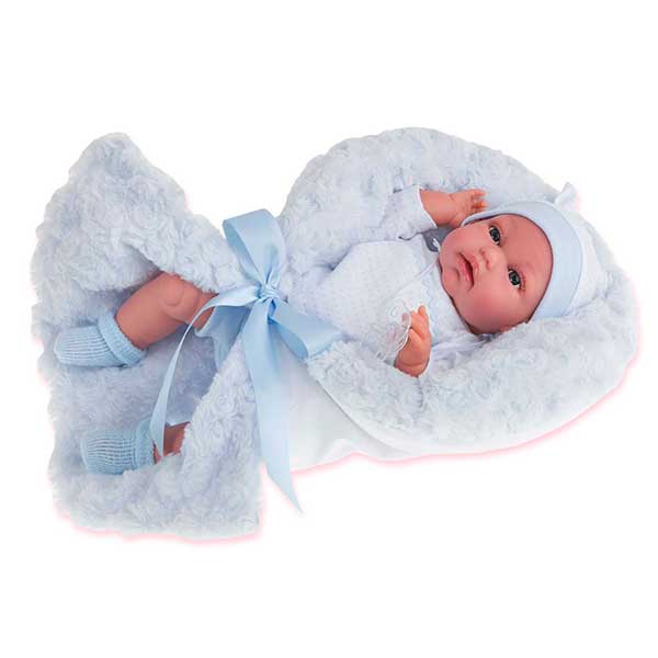 Muñeco de 34cms vestido con un conjunto azul clarito con un divertido gorrito azul y unos patucos a conjunto.
