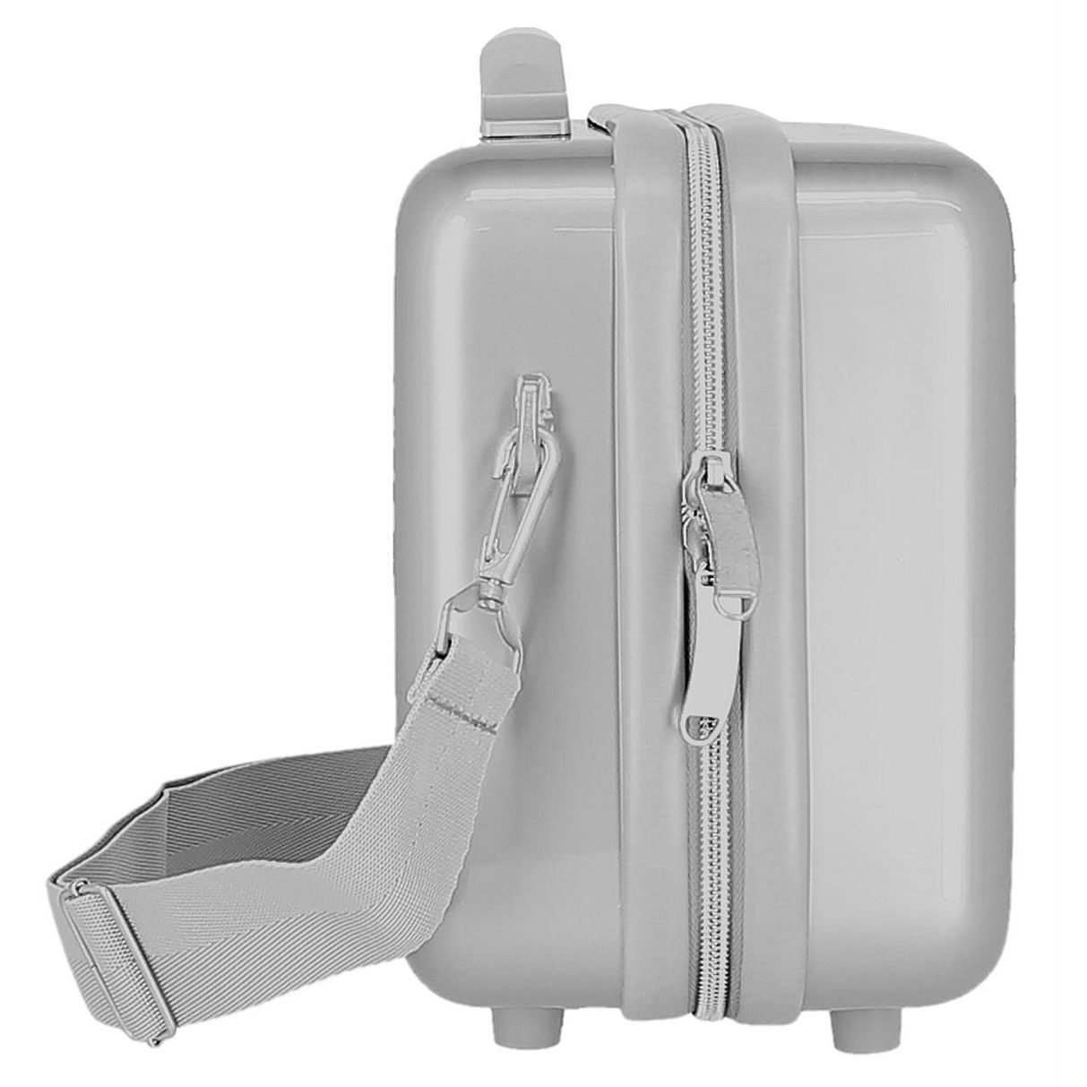 Posibilidad de llevarla con la bandolera que incorpora o de adaptarla a la maleta con la banda trasera para ahorrar espacio. Tiradores de cremallera con agujeros para candado.
