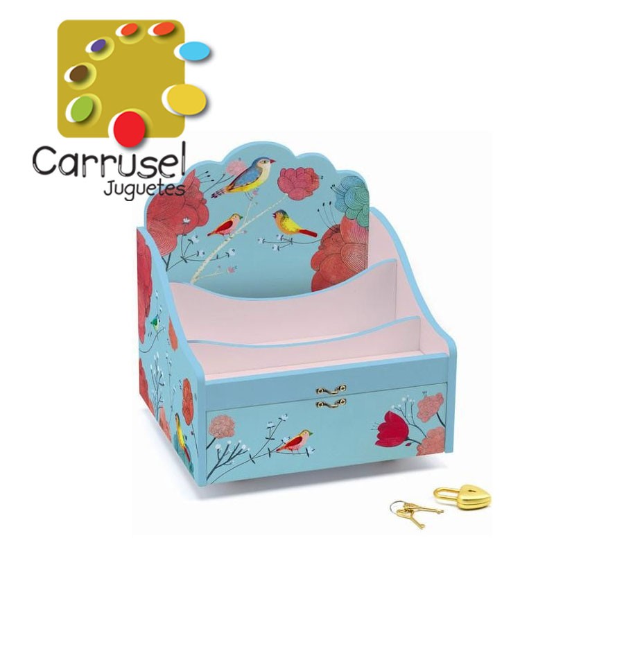 Precioso organizador de madera azul decorado con dibujos de flores y pájaros.