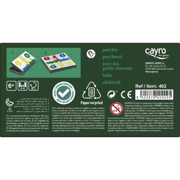 Es un tablero de parchís que se dobla por la mitad para convertirse en un estuche y así que se puedan guardar las fichas. La superficie es metálica y las fichas magnéticas, así que junto a su reducido tamaño lo hacen ideal para viajes. Podrás jugar en movimiento y no se te caerá ninguna ficha.