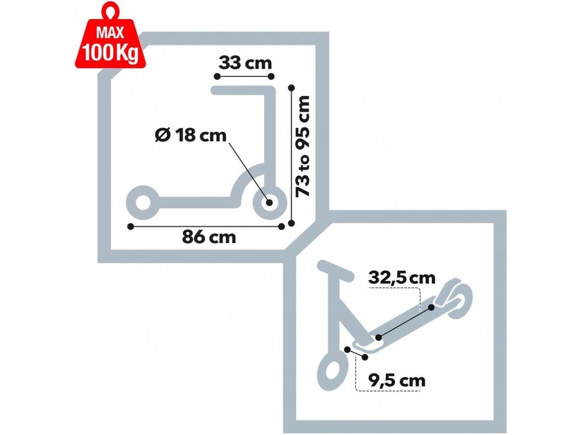 El patinete tiene 2 ruedas de PVC naranja de 18 cm de diámetro, base de 32,5 cm de largo x 9,5 cm de ancho.