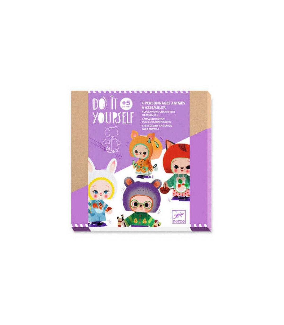 4 mecanismos andadores de cuerda, 18 piezas de cartulina ilustrada para decorar y 1 folleto de instrucciones.