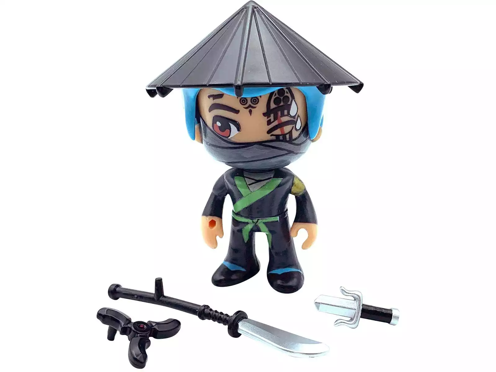 Incluye: 1 figura articulada Ninja Sombrero Negro con 1 naginata, 1 daga y 1 shuriken.