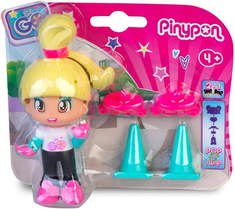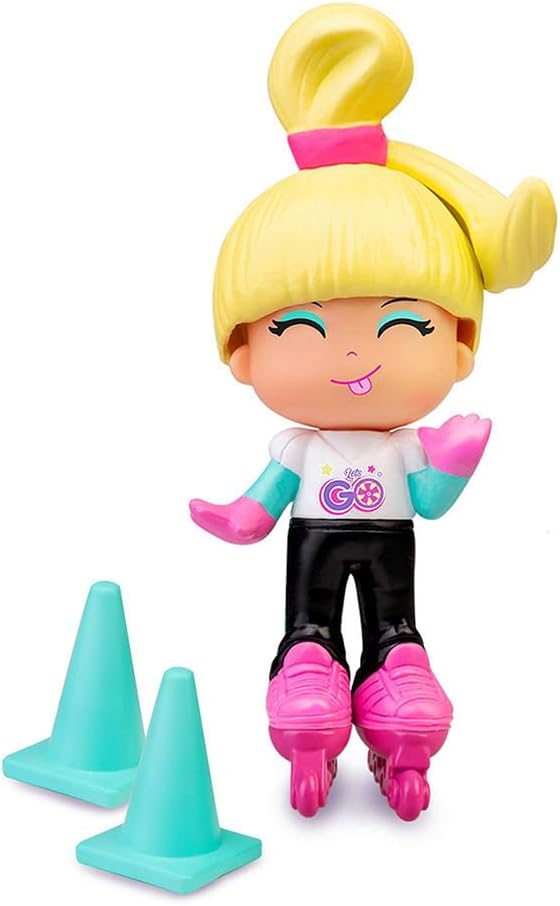 Incluye: 1 muñeca Pinypon con pelo rubio, 1 par de patines de color rosa para la muñeca y 2 conos de color azul.