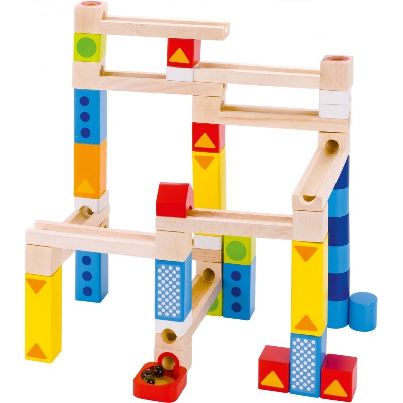 Esta pista de canicas consta de 55 piezas de madera maciza.