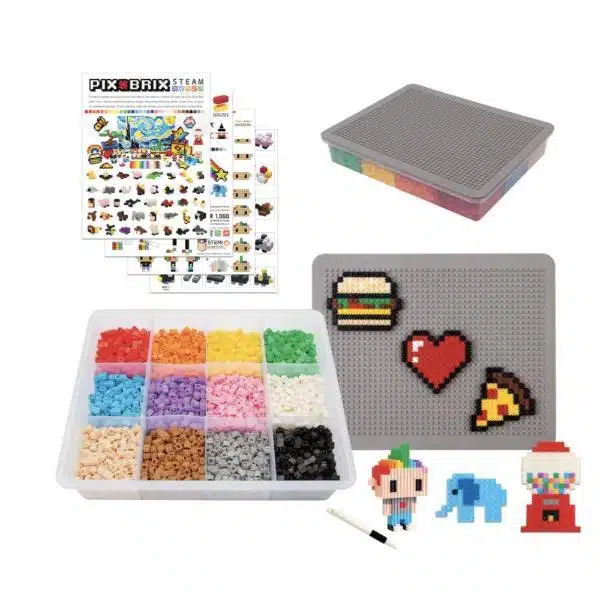 Incluye 3000 piezas de 12 colores diferentes, caja de transporte con bandeja clasificadora y tapa customizable, herramienta «Pix Brix Tool».