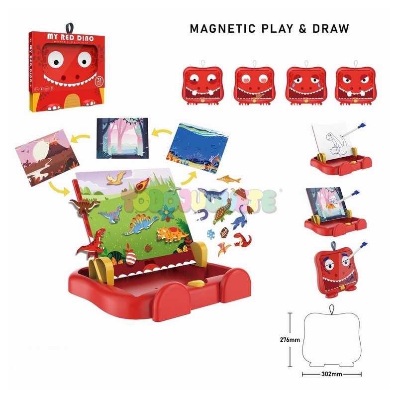 Divertida pizarra blanca y magnética con diseño de dinosaurio. Incluye 35 piezas magnéticas, un rotulador con borrador en la punta y 2 tarjetas con paisajes, del tamaño de la pizarra, en las cuales puedes colocar los imanes.