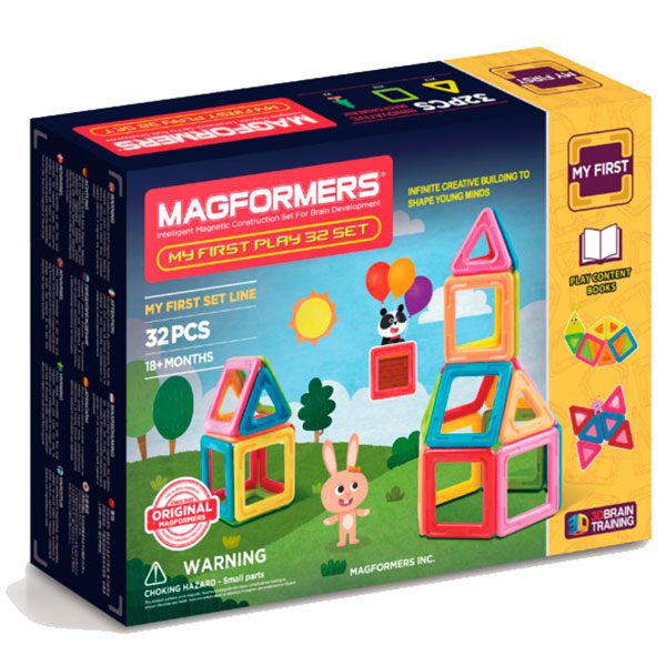 Conjunto actividades Mi Primer Set Magformers 32 piezas magneticas. El set incluye triangulos basicos, cuadrados, arboles y 2 libros ilustrativos y actividades. Con la guia de los libros, las niñas, niños y padres pueden completar las actividades para crear formas y entender los conceptos en 2D y 3D. Edad recomendada: +18 meses.