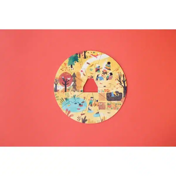 Incluye 4 puzles, de 10 piezas cada uno, que se montan uno sobre otro para ir descubriendo cómo cambia la naturaleza en cada estación, con una casa de madera.