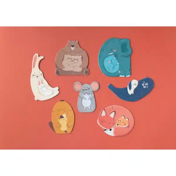 7 puzles de 3 piezas grandes de ilustraciones de distintos animales abrazando a sus crías.